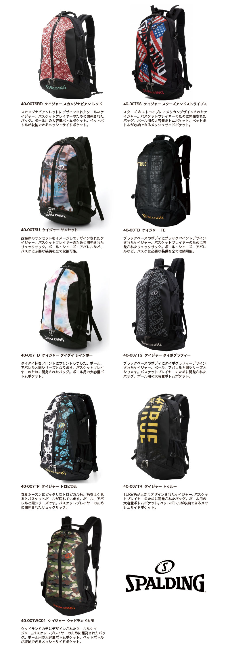●素材:ポリエステル ●サイズ:W35 x H57 x D32cm ●容量:32L ●バスケットプレイヤーのために開発されたバッグ ●ボール・シューズ・アパレルなど、バスケに必要な装備を全て収納可能 ●ボール用の大容量ボトムポケット ●シューズ用フロントポケット ●ペットボトルが収納できるメッシュサイドポケット ●カラー 40-007ND ケイジャー ノルディック *ノルディックデザインがされたケイジャー。